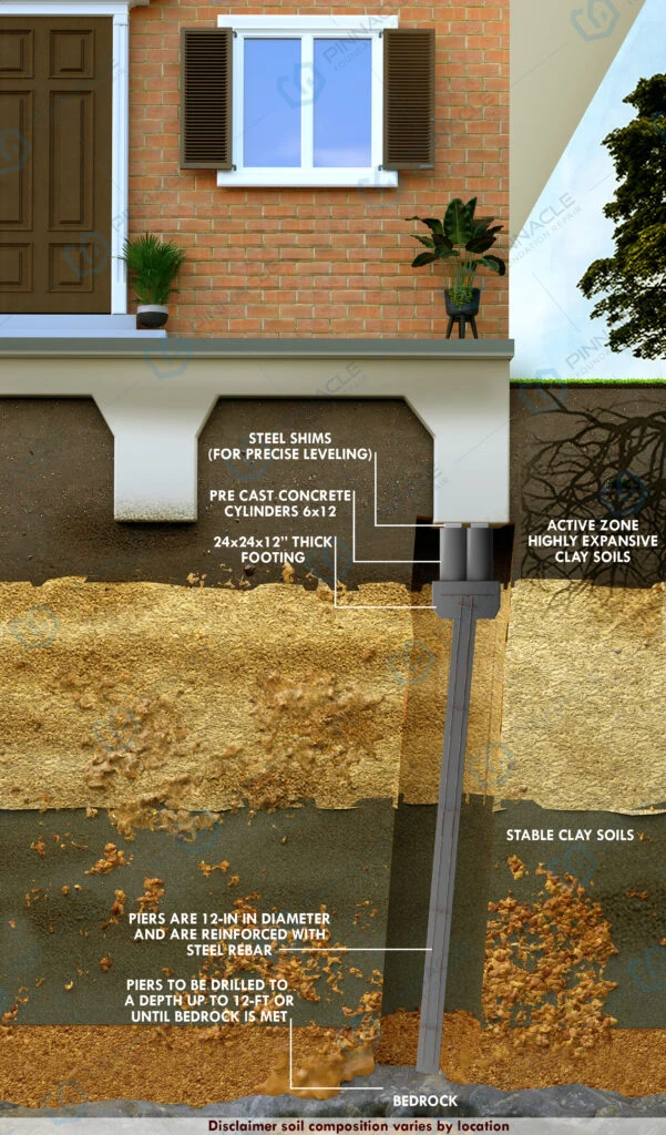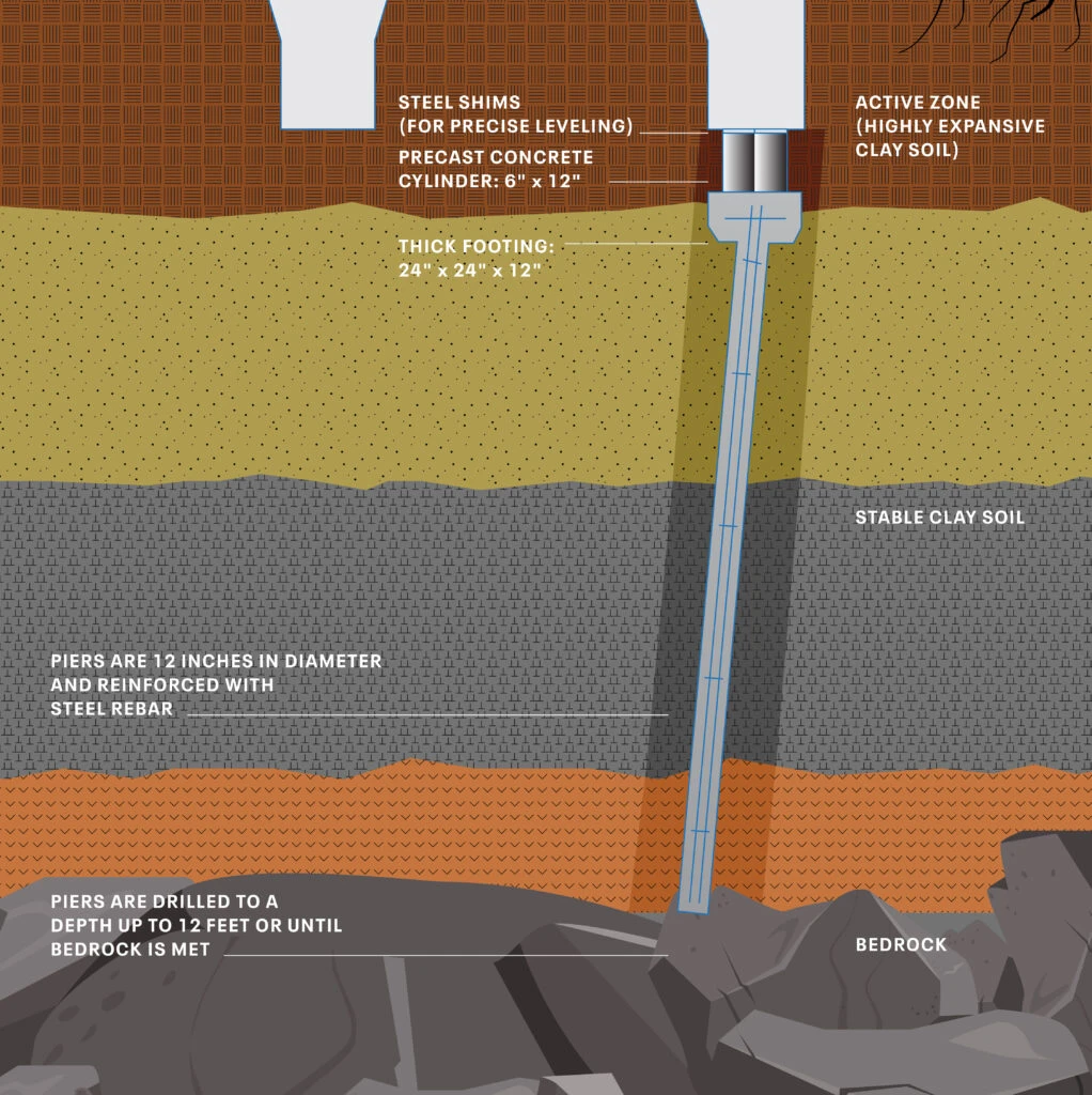 Drilled piers are 12–18 inches wide, reinforced with rebar, and poured with a high-strength concrete mix. They typically extend about 12 feet deep.